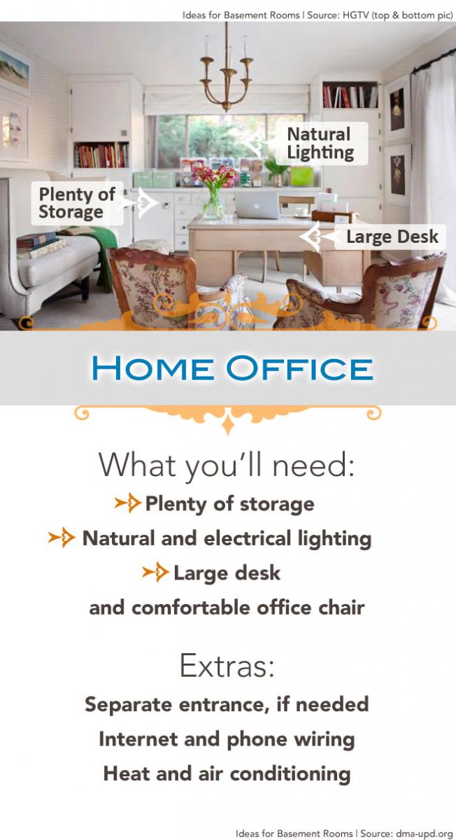 If you work at home, turning your basement into a home office can create a private oasis away from household noise so you can be just as productive as you would be at the office. If you will have clients visiting you there, talk to your home remodeler about adding a separate entrance that leads directly into your basement office. Incorporating plumbing for a coffee station and bathroom will offer the creature comforts of a traditional office space with the convenience of being at home. Be sure your home office is equipped with internet and phone wiring, plenty of storage, natural and electrical lighting, access to heating and cooling, and then furnish it with comfortable furniture.