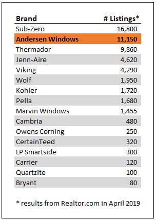 We took a look at the popularity of brands in real estate listings on Realtor.com in April 2019. The data backs up the high-quality brand influence mentioned previously. Here’s a short list sorted by number listings. Sub-zero is far and away the leader in total number of listings, and of the Top 5, only one isn’t in the kitchen, Andersen Windows.