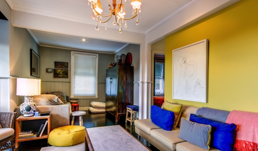 Colors can control the mood of a space, but for next level enhancement, consider accenting by introducing a unique couch or personal artwork.