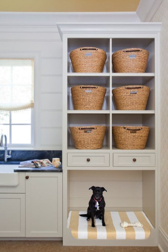 Every pup needs their own bed, right? Creating a built-in bed for your fur baby is a great space for them to claim as their own. According to the American Humane Association, ” As den animals, dogs need a sanctuary that is just large enough for them to fit inside and feel secure.” This kind of design can be built in any area of the home that you desire and can be made to match the style of your home. If you want to incorporate a sleeping area in your laundry room, you could also include a step-in washing area that makes it easy to wash off your pup.