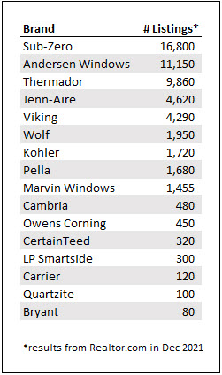 We took a look at the popularity of brands in real estate listings on Realtor.com in January 2021. The data backs up the high-quality brand influence mentioned previously. Here’s a short list sorted by number listings. Sub-zero is far and away the leader in total number of listings, and of the Top 5, only one isn’t in the kitchen, Andersen Windows.